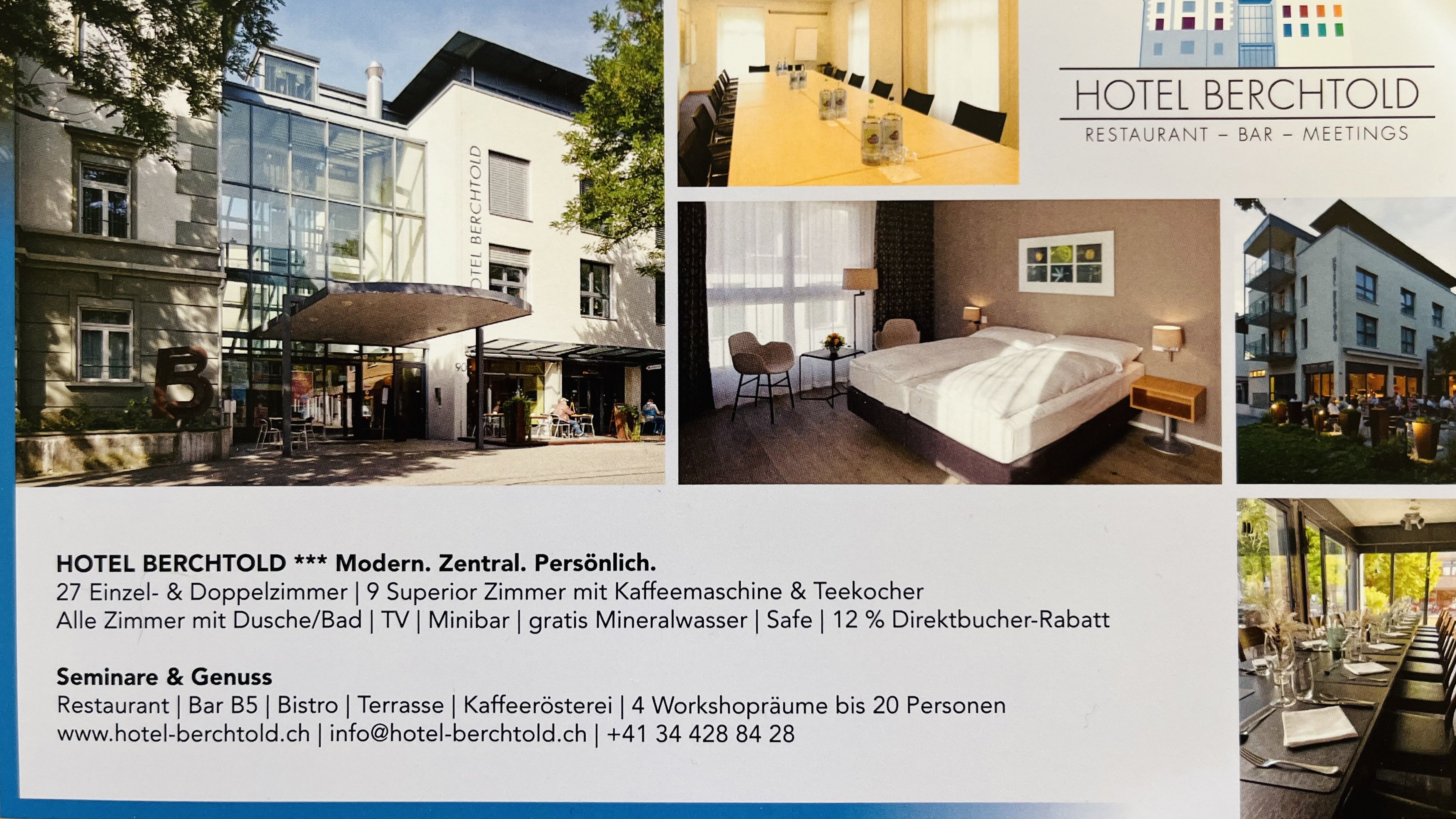 Das Hotel Berchtold ist die ideale Lokalität für Seminare und Sitzungen mit bis zu 20 Personen. Die zentrale Lage sowie die gut ausgestatteten Räumlichkeiten zeichnen unser Angebot aus. Durch die direkte Nähe zur Hotellobby und der Gartenterrasse ist sowohl konzentriertes Arbeiten, aber auch ein gelegentliches Erholen und wieder Kraft tanken möglich. Dank der flexiblen Aufteilungsmöglichkeiten sind die Räume gleichermassen für Unternehmen, Vereine, Clubs, Parteien geeignet.