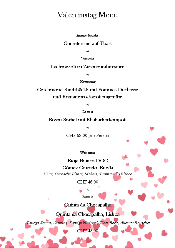 Wir bieten Ihnen ein schönes Menu inklusive einer Weinempfehlung an, die Gerichte sind auch einzeln erhältlich. Reservieren Sie Ihren Tisch doch frühzeitig und sichern sich einen Platz für ein romantisches Nachtessen zu zweit.